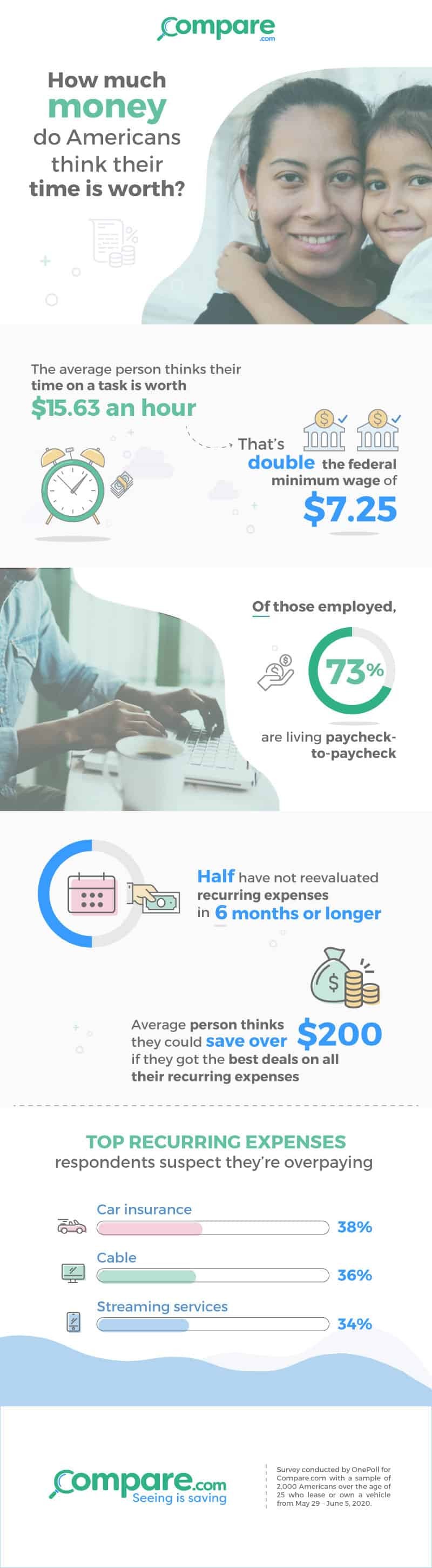 The survey – conducted by OnePoll on behalf of Compare.com – revealed 73% are employed and, of those who have a job, two-thirds are living paycheck-to-paycheck. Two in three (65%) confessed they get the “balance blues” after checking their bank statement. Seven in ten wish they could save more for the future, but they don’t have the money to spare. It would take the average respondent eight months to save $1,000 without changing their spending habits. Still, many want to see big returns if they’re going to take the time to research different prices.. Compare.com CEO Allie Feakins said this is largely due to consumers having less time on their hands, even though many of them are working tirelessly to make ends meet. “More and more Americans are finding themselves falling behind financially,” Feakins said. “This is leading to an increasing number of people looking to work multiple jobs or find secondary income elsewhere, which gives consumers even less time on their hands to research big purchases and find the best deals.” The average person would have to save more than $100 on a big-ticket item to make it worth spending an hour comparing prices. One area many respondents believe they’re leaving money on the table is their recurring expenses. Half confessed they haven’t reevaluated their recurring expenses in six months or longer. Seven in ten admitted to forgetting to check out those frequent expenses for potentially better deals. The average respondent thinks they could save more than $200 if they got the best deals on all their recurring expenses. The top expenses respondents suspect they are currently overpaying for include car insurance (38%), cable (36%), streaming services (34%) and cellphone bills (33%). “Consumers now have more recurring monthly expenses than ever before, but many of them don’t realize how much money they’re leaving on the table” Feakins added. Of those respondents with car insurance (71%), the average person has had the same insurance for more than five years. Over a quarter of respondents who currently have insurance confessed they wouldn’t know how much they’re paying without looking it up. Still, two-thirds want to save more on car insurance but think it’s a lot of work to find a better deal. The average person thinks they could save more than $175 if they took the time to shop around. More than 80%would want the shopping process to be quick and said they’d look at insurance options for only 24 hours before purchasing a policy. These figures echo those found by United Way in its most recent ALICE report (ALICE is an acronym for Asset Limited, Income Constrained, Employed), which focuses on individuals and families who live above the federal poverty line, but still cannot afford all of their basic living and household necessities each month. According to the report, more than 40% of American households fall beneath United Way’s ALICE threshold. Compare.com – who recently joined United Way’s National ALICE Advisory Committee – has seen the effects of these statistics firsthand, Feakins said. “For these groups of Americans, every dollar can make a difference,” she said, “but they are either not aware of the money they’re leaving on the table each month or they simply don’t have the time to spend shopping around for the best price. That’s why comparison platforms and similar tools are so important – it streamlines the process and allows customers to find the best prices quickly and easily, without forcing them to waste their time or money, or in some cases, both.”