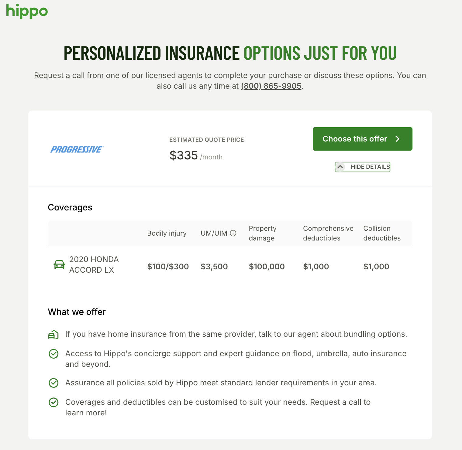 Hippo then provides you with a quote from its partner. We received a quote for Progressive insurance. You’re able to see a short overview of the coverage included in the new policy, but you’re not able to adjust your coverage options or deductibles.