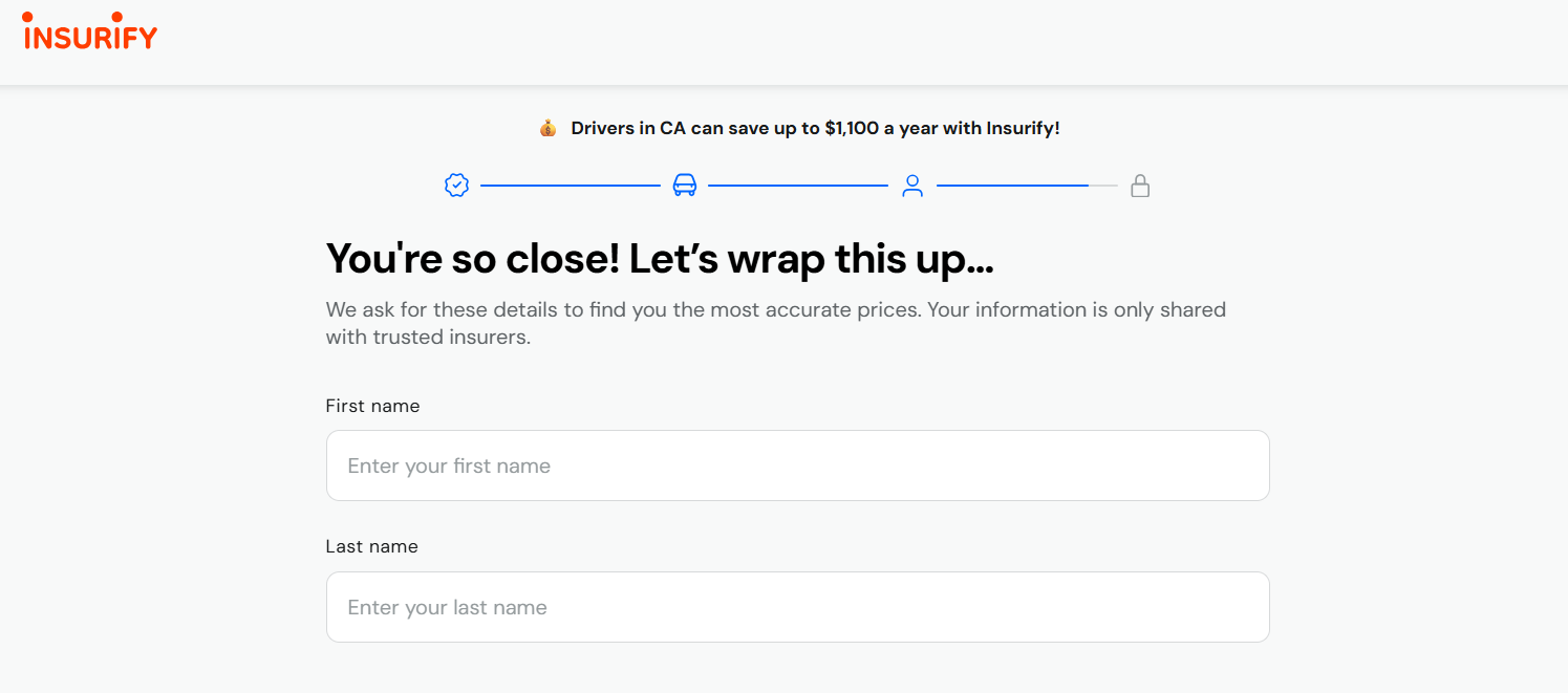 From here, you’ll enter Insurify’s auto insurance quote questionnaire. Throughout the process, each question gets its own screen, which makes the process simple and easy to navigate.
