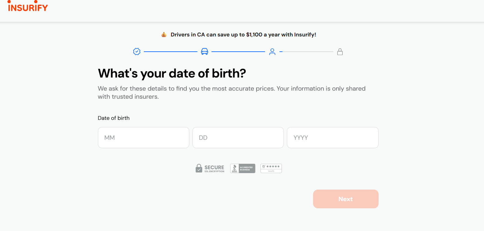 Next, you’ll see a screen that asks for your date of birth. Since age is a rating factor in car insurance, Insurify says your birth date will help serve up more accurate quotes.