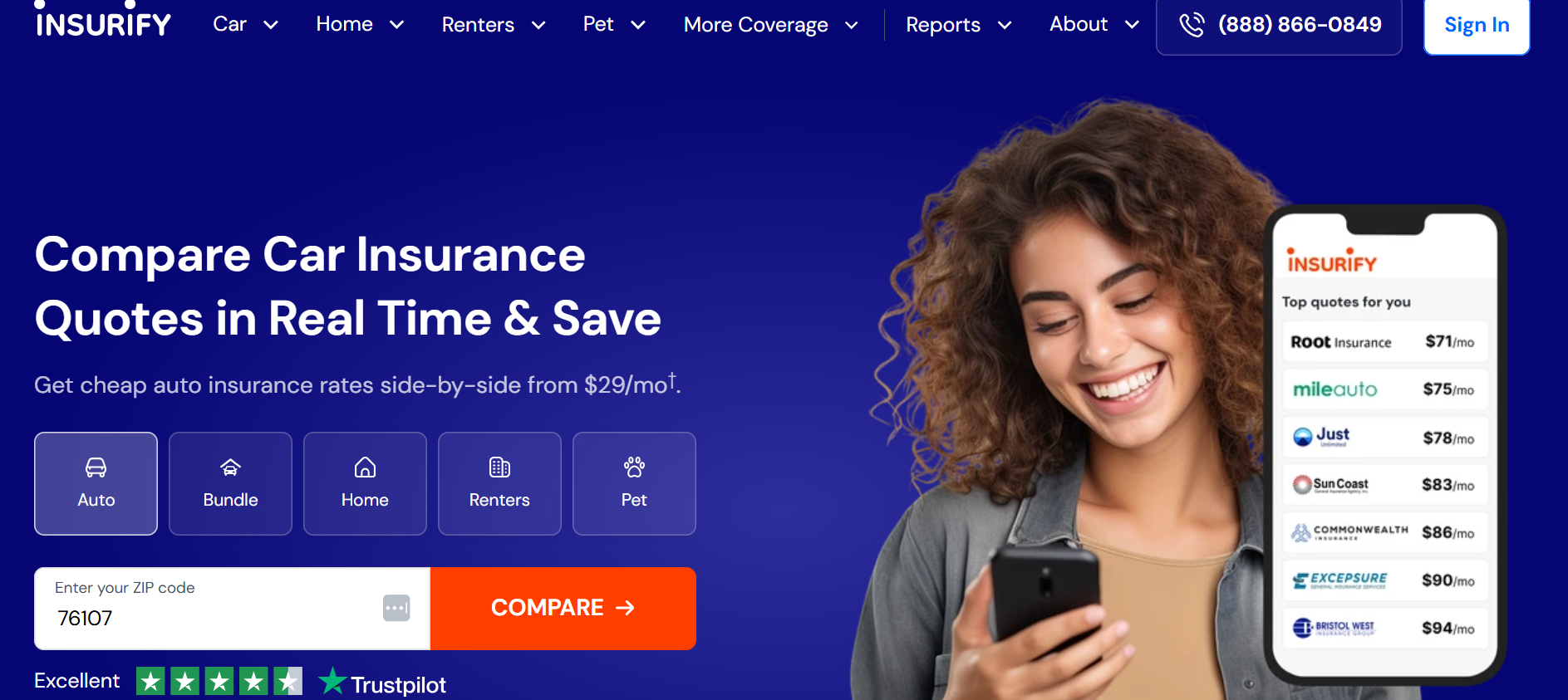 Insurify is a “virtual insurance agent” that lets you easily and quickly compare quotes from various car, home, renters, pet, and life insurance companies in a single place. By providing some personal information and answering a few questions about the various factors that help determine insurance rates, you’ll get personalized quote comparisons in a few minutes.