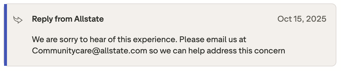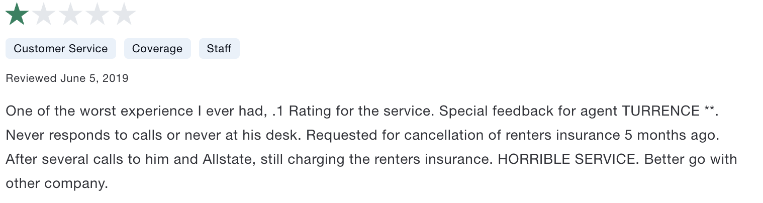Reading customer reviews is a great way to understand how an insurance company lives up to its promises. Allstate earns a 1.2 out of 5 Trustpilot rating, a 1.1 out of 5 ConsumerAffairs rating, and a 1.1 out of 5 Better Business Bureau (BBB) rating . While renters don’t account for all of those reviews, some common complaints still emerge.